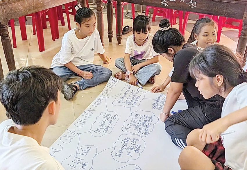 | Các bạn nhỏ thảo luận về chủ đề giới tính và trách nhiệm tại lớp tập huấn kỹ năng. Ảnh: HÀ NGUYỄN |