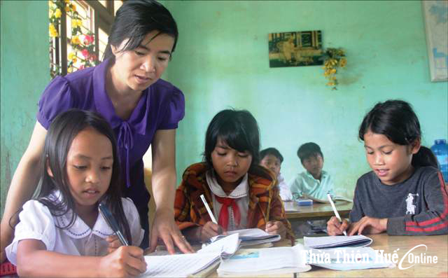 2. Tất nhiên, sẽ thiếu sót nếu không nhắc đến sự đóng góp của những thế hệ giáo viên kế cận. Có những người ngoại tỉnh chọn vùng đất này làm quê hương thứ hai. Họ đã cùng người dân thôn bản bao mùa say sưa trong tiếng cồng chiêng, cùng hát mừng lúa mới và san sẻ những lúc ngặt nghèo. Cô Đinh Thị Hạnh là một điển hình. Cô sinh viên Trường đại học Sư phạm Huế, quê Lệ Thủy, Quảng Bình nhỏ nhắn ngày nào bây giờ dường như chẳng thể tách rời vùng đất một thời heo hút. Tốt nghiệp năm 1997 với ngành học không phải yêu thích, với cô là nghề chọn người, và cô tình nguyện chọn vùng cao A Lưới làm nơi gieo chữ. Như lời cô nói, thời sinh viên thường xuyên tham gia các hoạt động tình nguyện ở vùng sâu, vùng xa giúp cô mạnh dạn, ra trường cô có nhiều sự lựa chọn nhưng lại lao vào “bể khổ”. “Lúc ra trường mình có cơ hội làm việc ở những nơi có điều kiện hơn, nhưng cuối cùng mình chọn A Lưới”, cô Hạnh chia sẻ.