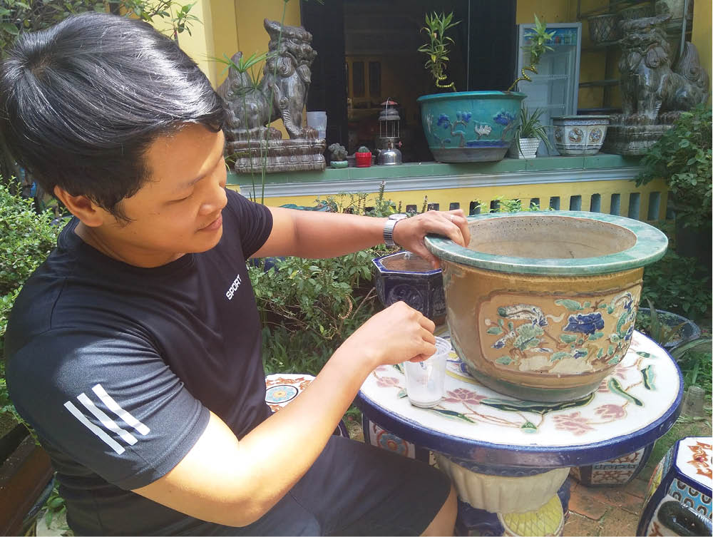 Công việc chăm sóc những chiếc chậu xưa hằng ngày