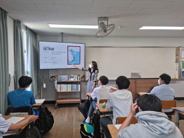 Uyên Sa trong một tiết dạy tiếng Việt cho học sinh Hàn Quốc