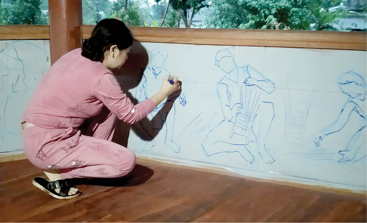 Những bức tranh trên nhà gươl thể hiện những sinh hoạt ngày thường của đồng bào Cơ Tu mà chị Nam đã rất đỗi quen thuộc sau 16 năm sinh sống. “Những hình ảnh bà con đi làm rẫy, gánh nước, các em nhỏ đi bộ đến trường,… hay những buổi liên hoan cồng chiêng đã luôn đọng lại trong tâm trí mình mỗi khi nghĩ về Nam Đông. Chính vì vậy, mình đưa những hoạt động thường nhật đó vào những bức vẽ, để du khách mỗi khi ghé đến tham quan nhà gươl, nhìn vào đó sẽ có được cái nhìn tổng quát về cuộc sống của đồng bào tại nơi đây”, chị Nam cho hay.