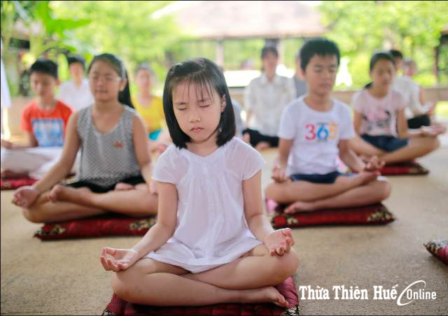 Sau phần giới thiệu, đám trẻ được xếp thành hàng dài đi tham quan một vòng Cát Tường Quân để được tự mình khám phá ngôi nhà mang kiến trúc đặc trưng nhà vườn Huế. Chưa hết ngỡ ngàng về vẻ đẹp của không gian nơi đây, các cô cậu bé tiếp tục bước vào một sự háo hức mới khi nghe vị chủ nhân Cát Tường Quân nói: “Bây giờ các con sẽ học tĩnh tâm nghen”. Ồ, người lớn mới học tĩnh tâm chứ trẻ nhỏ mà học tĩnh tâm ư?! Nhiều người hẳn sẽ nghĩ vậy, nhưng, theo lý giải của bà Thảo: “Tĩnh tâm là một cách để tập trung trước khi thi, trước những lúc căng thẳng, hay trước khi phải giải quyết công việc nào đó. Tĩnh tâm là thả lỏng hoàn toàn đầu óc như thể một cốc nước đã lắng hết cặn để lại phía phần nước trong bên trên. Tĩnh tâm giúp đầu óc trở lại trạng thái trong lành để có thể giải quyết các tình huống căng thẳng hay vấn đề nào đó tốt nhất. Đây là lý do các trường ở Mỹ đã đưa thiền vào trường học để giảm stress, ngăn ngừa bạo lực trong học đường và giảm hành vi mất kiểm soát của học sinh”.