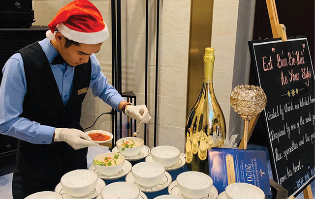 Một điểm đặc biệt của cocktail Bún bò Huế, đó là phương thức phục vụ. Không phải ly thủy tinh sang trọng, ngược lại, người thưởng thức sẽ được nhận một tô... cocktail với rau mùi, chanh ớt trang trí. Bất ngờ nhất là hương sả thơm lừng khi tô cocktail được mở ra. Khung cảnh như ngồi một quán đông, thực khách được phục vụ một tô bún bò Huế rặt nóng hổi, bốc khói. Nhẹ nhàng hút nước từ ống hút sả (đây cũng là một điểm sáng tạo, cọng sả lồng vào nhau tạo thành ống hút vừa thân thiện với môi trường, vừa tinh tế, tạo hương). Tất cả hương vị của bún bò Huế bùng cháy nơi đầu lưỡi, dần tan, thơm, nồng, mượt mà và đặc sắc.