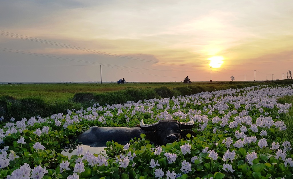 Hình ảnh con trâu nằm nghỉ sau những giờ cày bừa ở xã Vinh Xuân, huyện Phú Vang khi hoàng hôn về