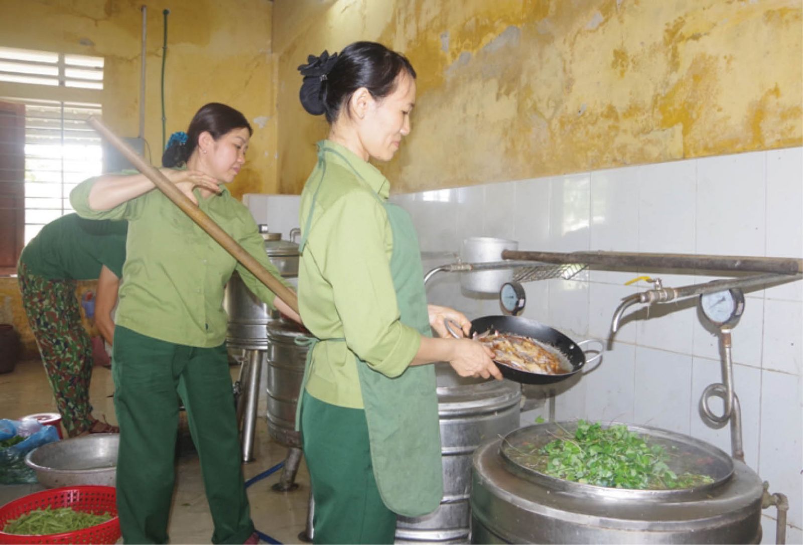 Thượng úy chuyên nghiệp Tô Thị Thắm (ngoài cùng) chuẩn bị bữa ăn cho bộ đội