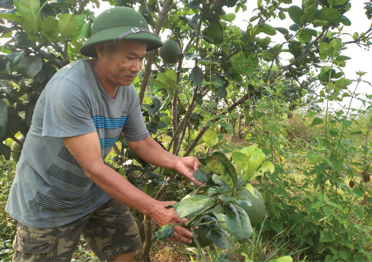 Được địa phương cấp đất nông nghiệp hơn 2 ha trên quả đồi khô cằn sỏi đá, ban đầu ông trồng sắn để giải quyết lương thực trước mắt, phục vụ khai phá rừng kiệt trồng cây keo lai. Nghe có nơi trồng dược liệu hiệu quả, ông cải tạo đất đồi để trồng cây cà gai leo nhưng không tìm được đầu ra. Thấy mô hình trồng cây thanh trà của xã bạn, nhưng thổ nhưỡng ở đây không bằng nơi đất phù sa sông Hương, sông Bồ, nên ông mạnh dạn đầu tư trồng bưởi da xanh. Ông đã đào hố ủ phân hữu cơ, làm hệ thống tưới nước, phân khu đất phù hợp để trồng thêm cam sành, thanh trà. Hơn 10 năm đầu tư công sức, đến nay, trang trại của ông mới cho quả ngọt.