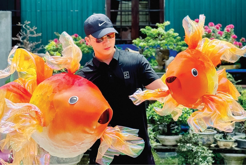 Phước Sơn cho biết: “Những chú cá khổng lồ này hiện nay đang rất được yêu thích. Đây cũng là sản phẩm chủ lực trong số các sản phẩm thủ công mà mình thực hiện”.