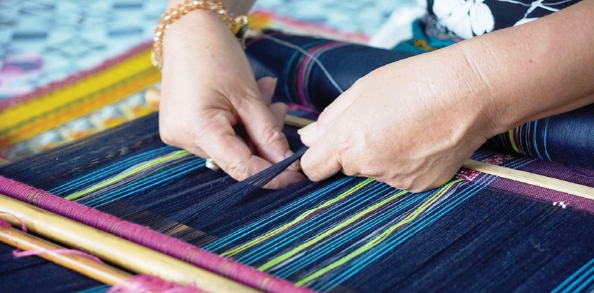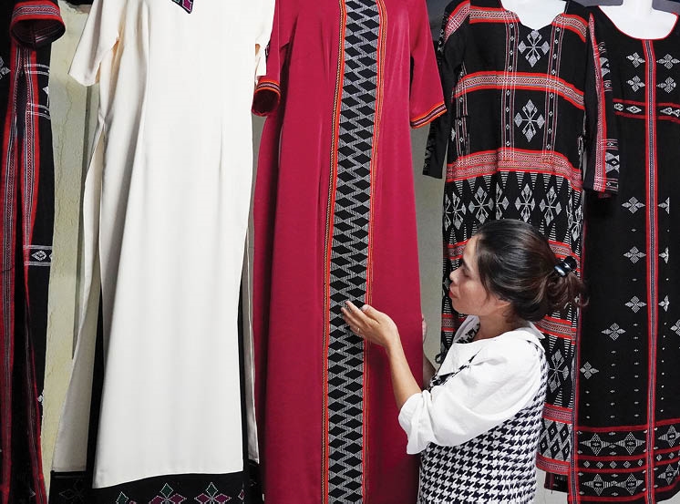 | Chị Blup Thị Hà, Giám đốc HTX Thổ cẩm xanh azakooh với những sản phẩm zèng từ truyền thống đến hiện đại |