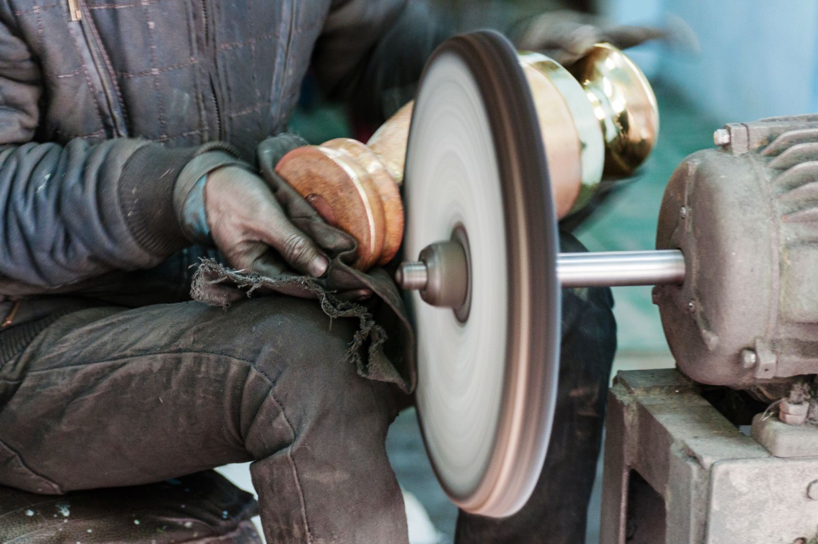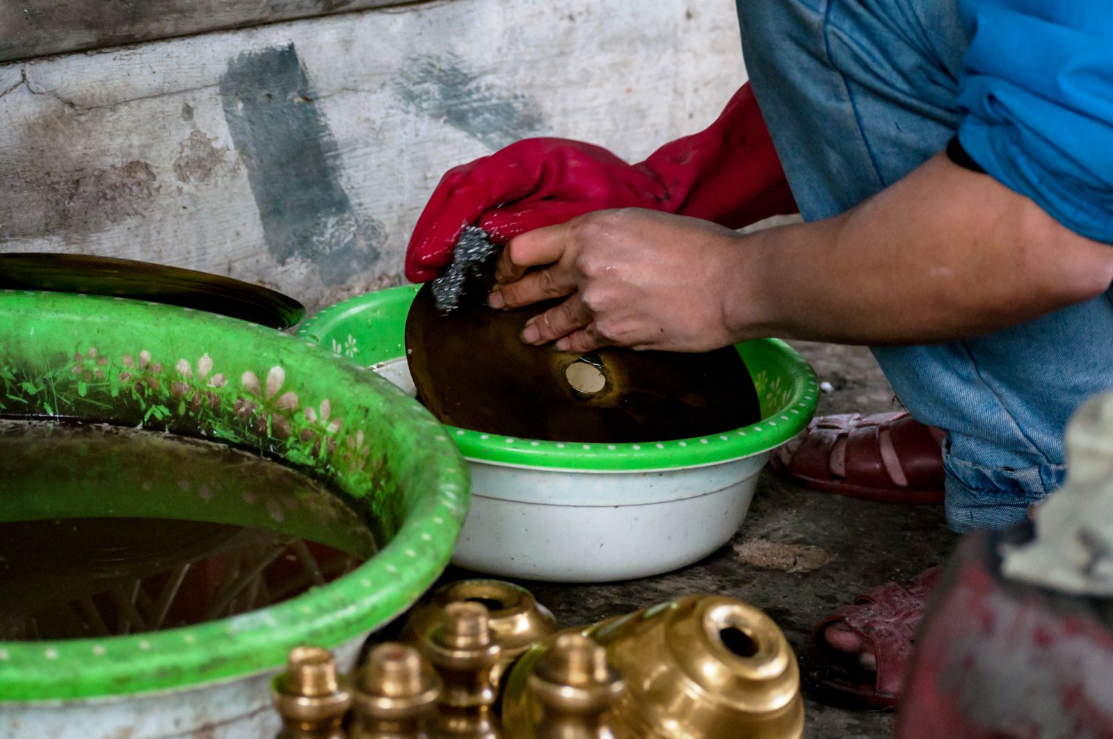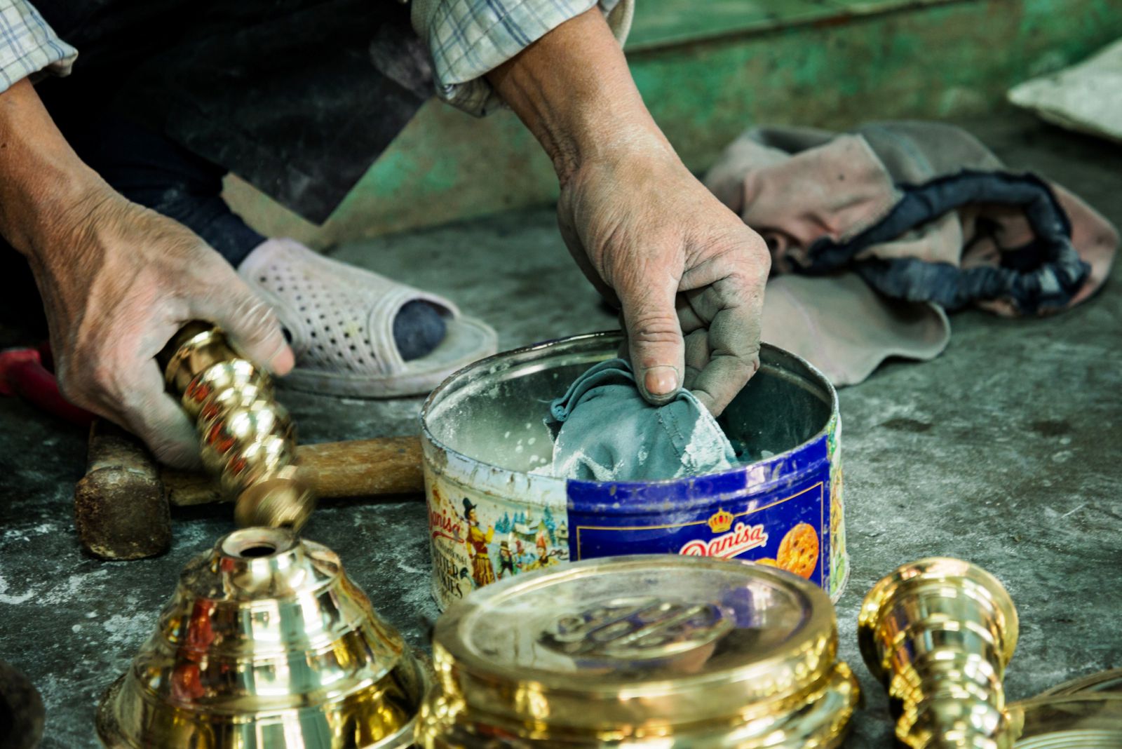 Người thợ cẩn thận chùi từng chi tiết của đồ đồng...