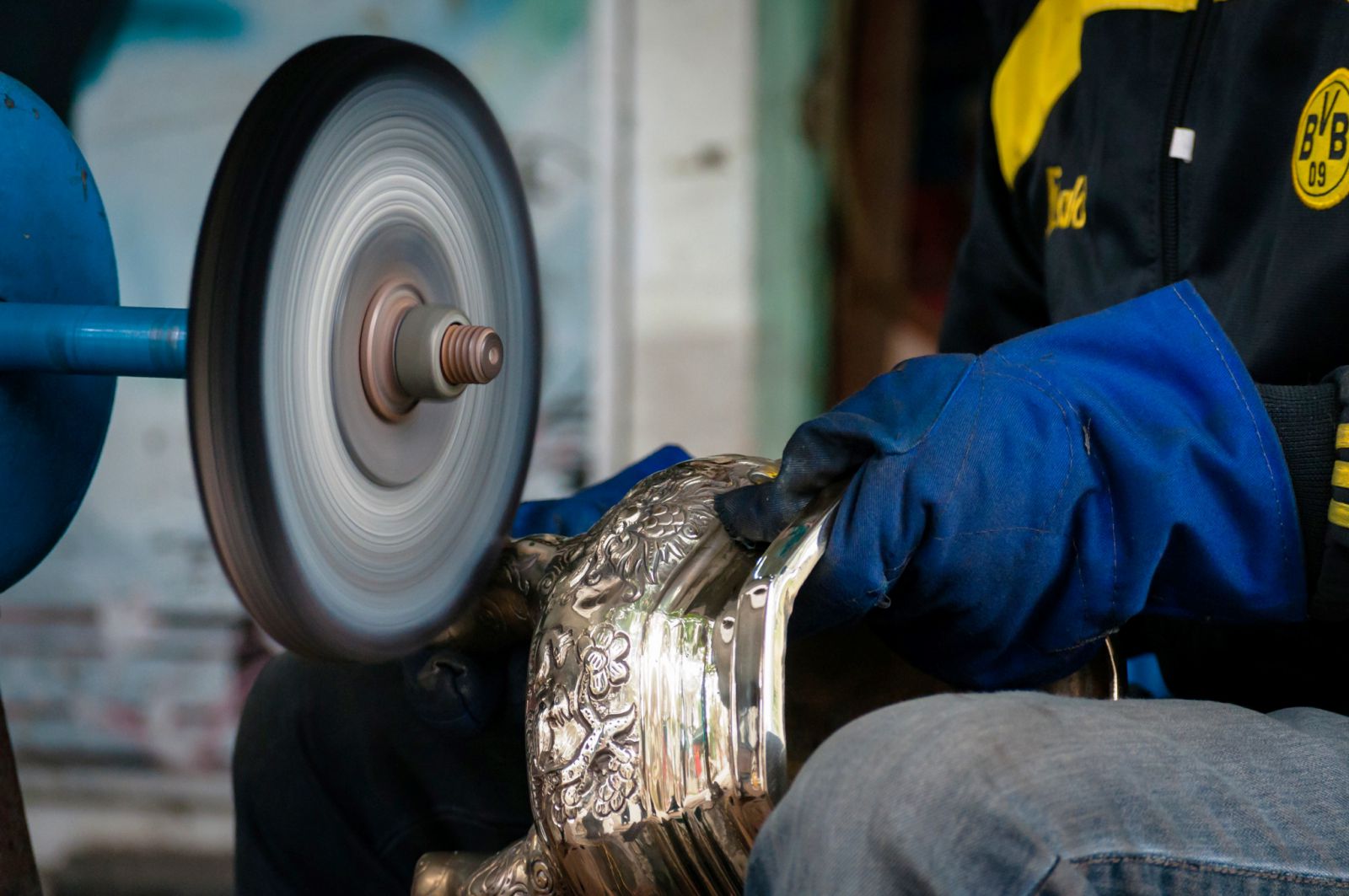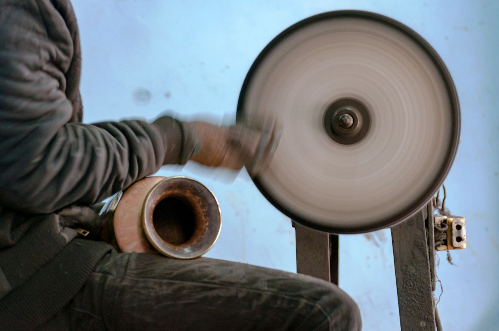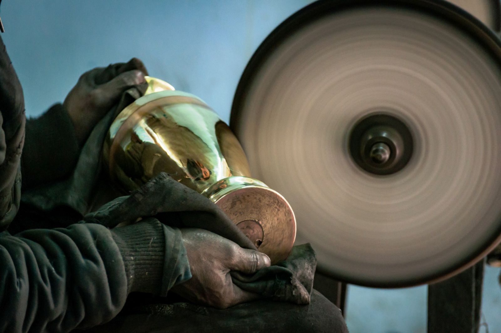 Người thợ cẩn thận chùi từng chi tiết của đồ đồng...