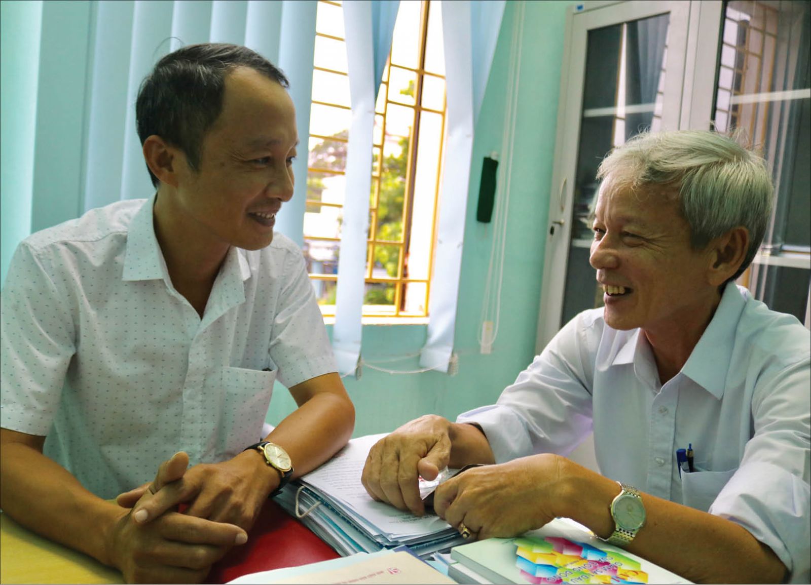 Ông Nguyễn Văn Ngoạn (bên phải) trao đổi công việc cùng cán bộ Mặt trận phường Phước Vĩnh