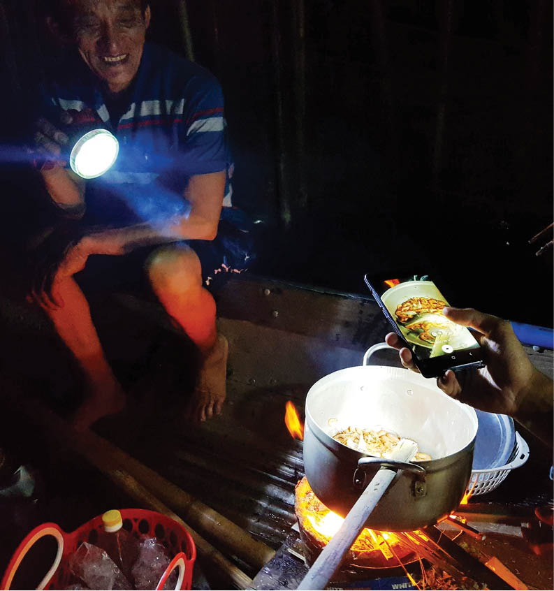 Khi màn đêm đặc quánh, bữa cơm “dã chiến” được dọn xong. Ai cũng lặng lẽ ăn bữa cơm dân dã nhưng ngon đến khó tả. Tiếng xuýt xoa khen vị cá lạ, thịt dày hòa giữa khung cảnh mênh mông, tiếng nước vỗ mạn đò, gió thổi mát lành… “Ngon quá. Lâu lắm rồi mới được ăn một bữa cơm đặc biệt, ở một không gian “sang trọng” như thế”, chàng trai Bùi Triệu Khoa, 27 tuổi, người Huế làm việc ở TP. Hồ Chí Minh, tấm tắc khen. Khoa lần đầu tiên trải nghiệm “chơi đêm” trên phá Tam Giang, nên mọi thứ khá lạ lẫm, bất ngờ.