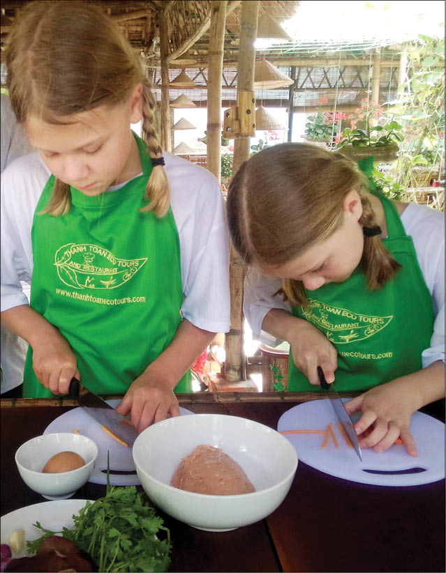 Du khách nhí cũng chăm chú khi thực hiện các món ăn đặc trưng của Huế