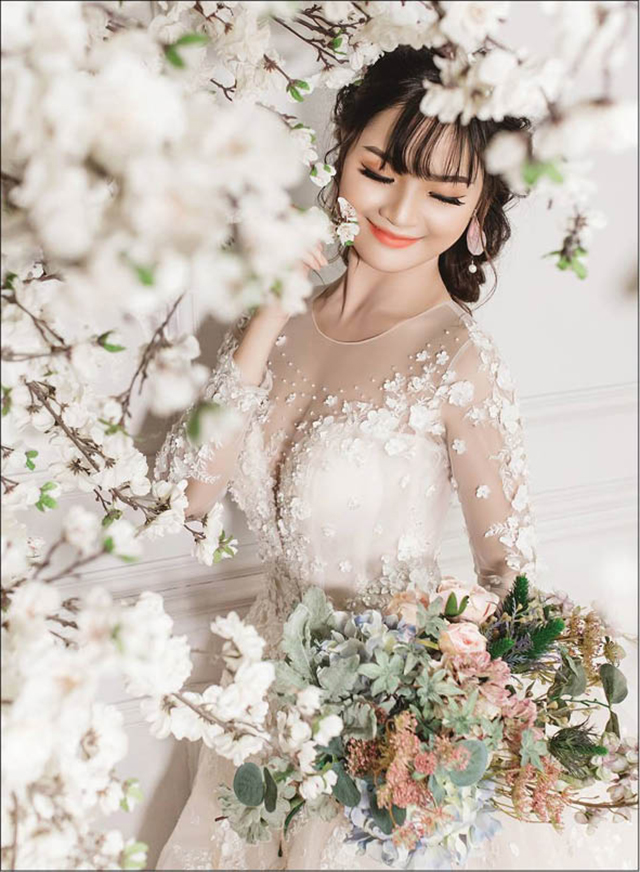 Vẻ đẹp lãng mạn của cô dâu bên “vườn” hoa tại phim trường. Ảnh: PHIM TRƯỜNG VIENNA HOUSE