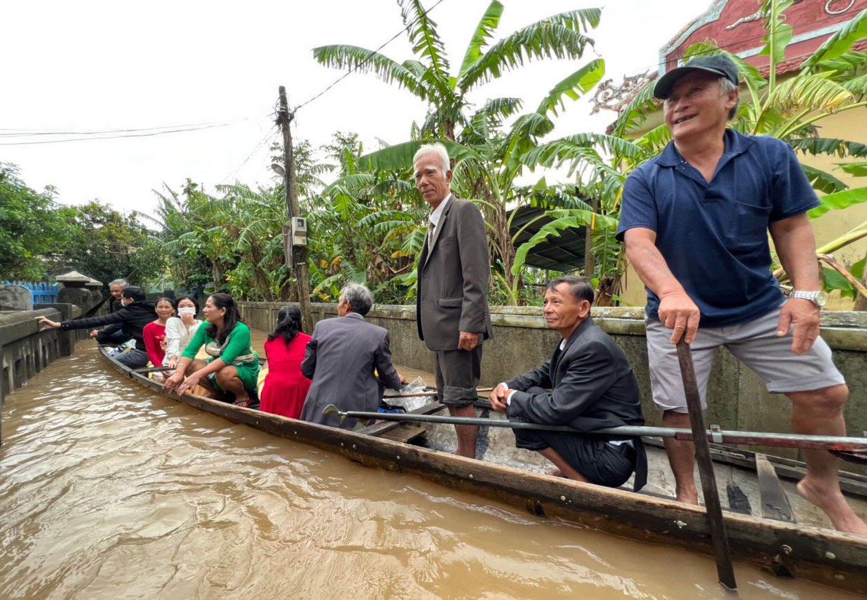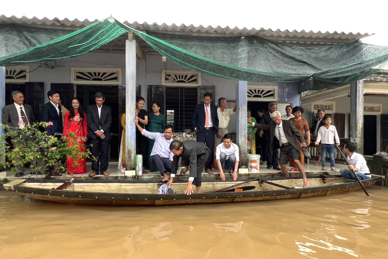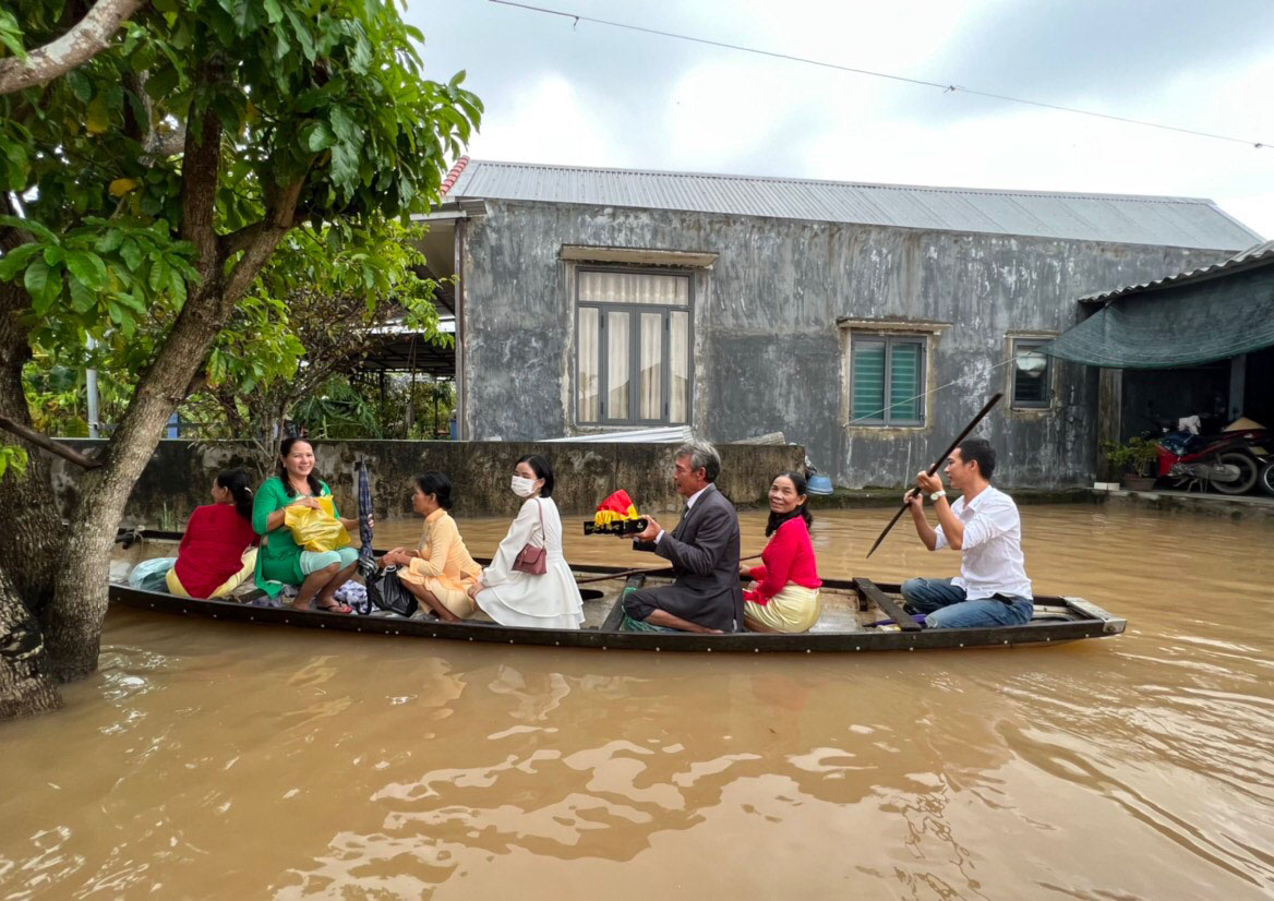 Chú rể Trường An cho hay, do tình hình mưa lũ đột xuất nên từ nhà chú rể (thôn Vân Quật thượng) sang nhà cô dâu (thôn Thanh Phước) khoảng 3km phải thuê đò máy. Hai người ở cùng một xã nên có phần thuận tiện trong đi lại, chỉ khác là mùa mưa lũ này phải dùng ghe thuyền. Đến cổng thôn Thanh Phước có ghe nhà gái và cả thôn hỗ trợ di chuyển vào làm lễ. Số lượng đoàn nhà trai cũng tiết giảm còn 10 người gồm ba mẹ, anh chị và bác ruột.
