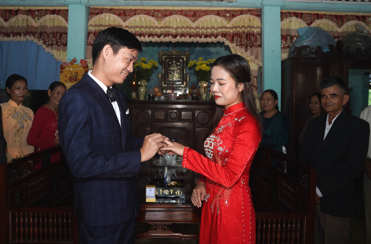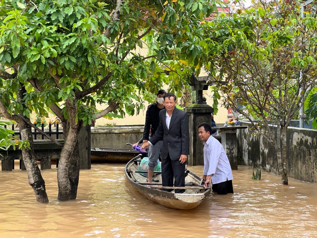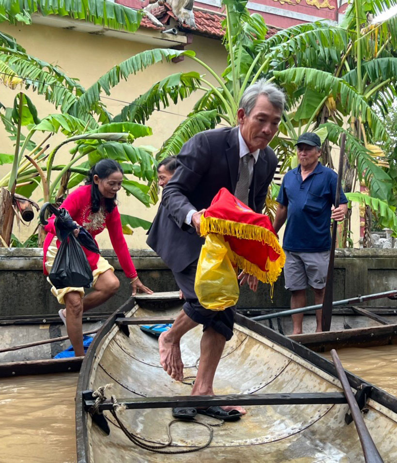 Chú rể Trường An cho hay, do tình hình mưa lũ đột xuất nên từ nhà chú rể (thôn Vân Quật thượng) sang nhà cô dâu (thôn Thanh Phước) khoảng 3km phải thuê đò máy. Hai người ở cùng một xã nên có phần thuận tiện trong đi lại, chỉ khác là mùa mưa lũ này phải dùng ghe thuyền. Đến cổng thôn Thanh Phước có ghe nhà gái và cả thôn hỗ trợ di chuyển vào làm lễ. Số lượng đoàn nhà trai cũng tiết giảm còn 10 người gồm ba mẹ, anh chị và bác ruột.