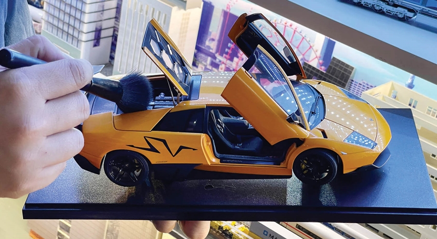 | Lê Thành Đạt vệ sinh thường nhật các chi tiết của xe mô hình tĩnh |