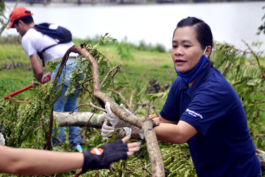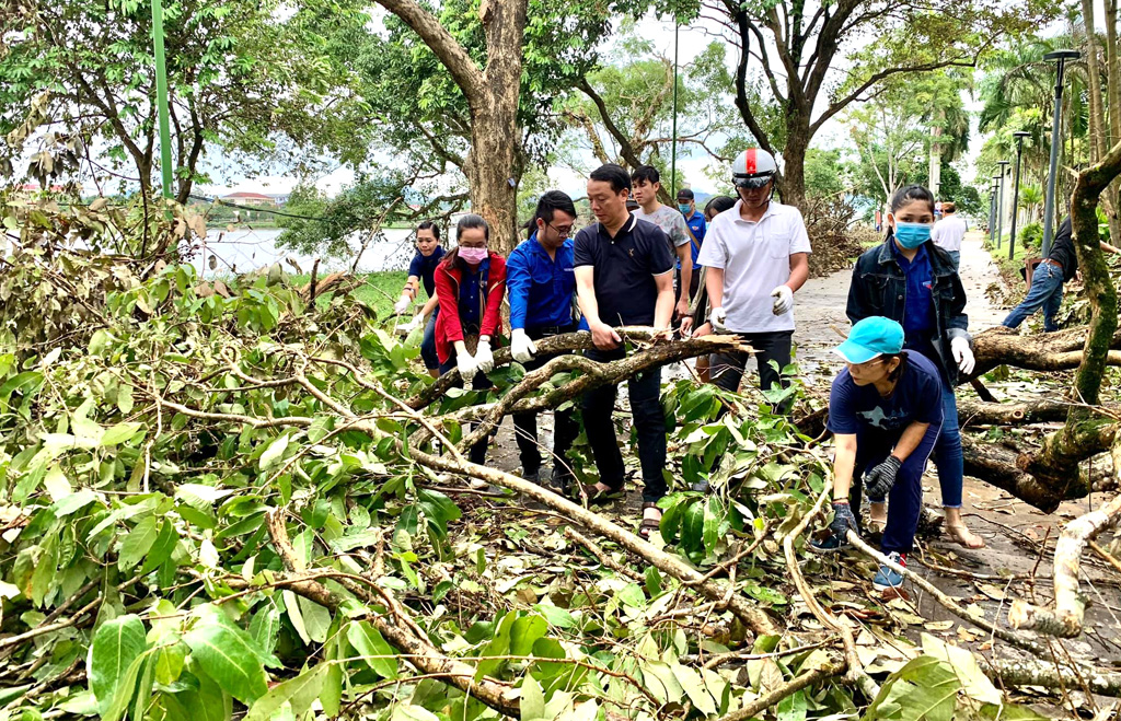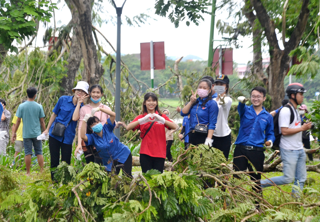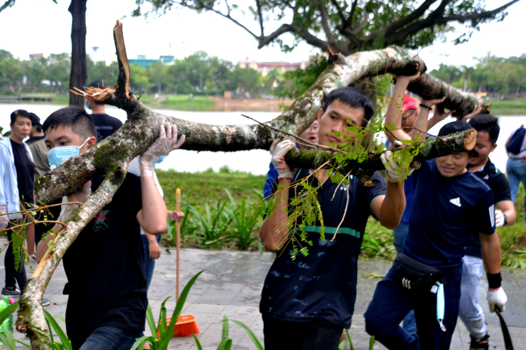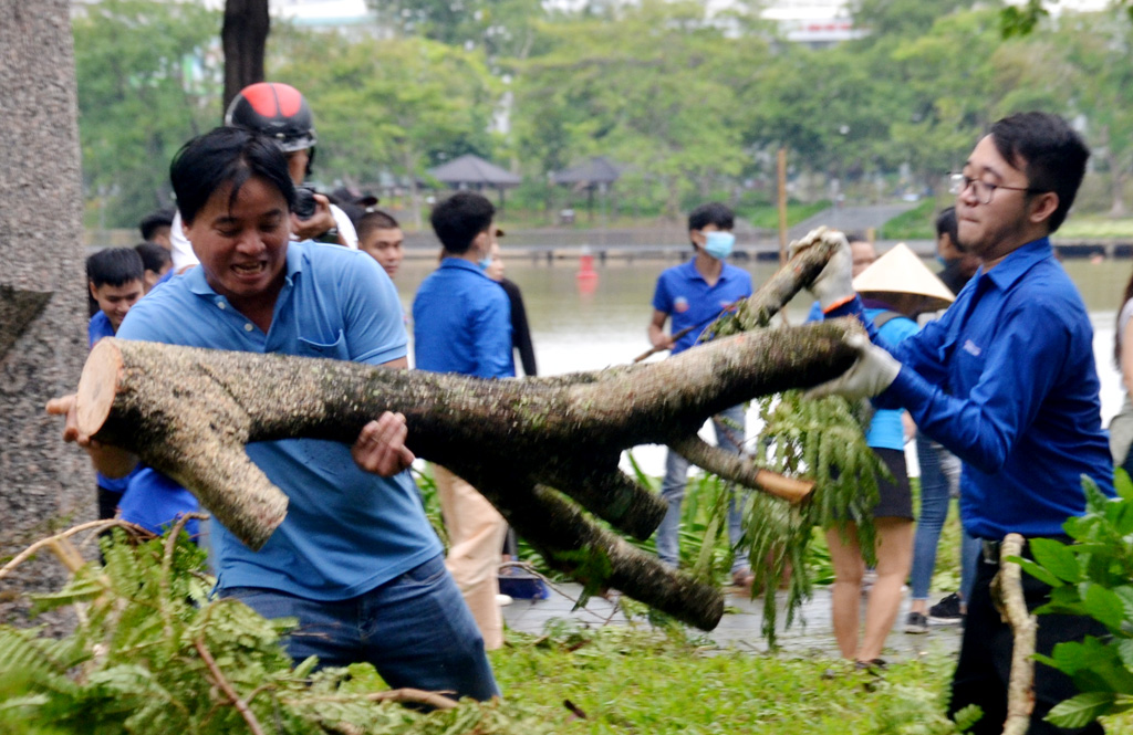 Trong sáng 20/9, hàng trăm cá nhân đến từ Trung tâm Công viên cây xanh, Công ty Môi trường đô thị Huế, Sở Du lịch, Hiệp hội Du lịch tỉnh, Trường cao đẳng Du lịch Huế… đã tập trung dọn dẹp cây đổ ngã, trả lại mặt đường cho con đường đi bộ.