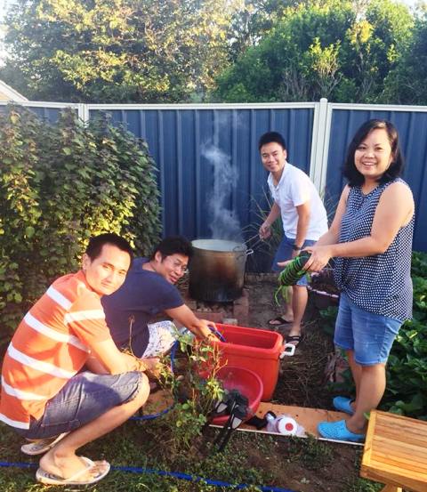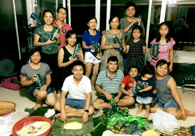Niềm vui đón Tết của du học sinh Lê Xuân Quang (áo trắng, ngồi) cùng bè bạn ở đất nước Úc xa xôi. Đến dịp Tết, Quang cùng bạn bè tự tay gói bánh tét như một cách tận hưởng hơi ấm Tết trên đất khách. Ảnh: X. Quang