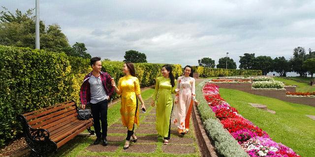 Với những du học sinh Huế đang theo học tại trường ĐH Auckland - New Zealand, mặc áo dài vào dịp Tết trên đất khách là cách ăn Tết rất riêng, vừa truyền thống, vừa khoe nét đẹp đến với bạn bè quốc tế. Ảnh: Nguyễn Vượng cung cấp