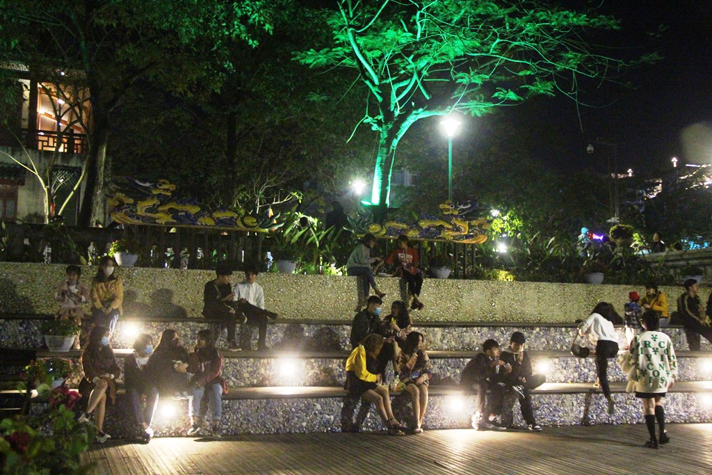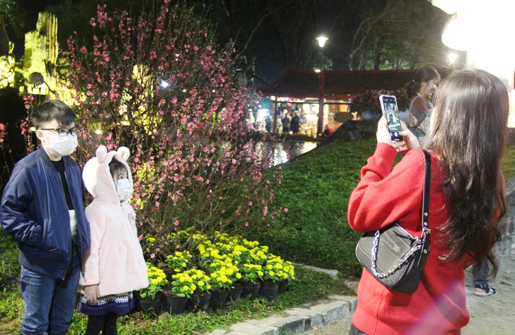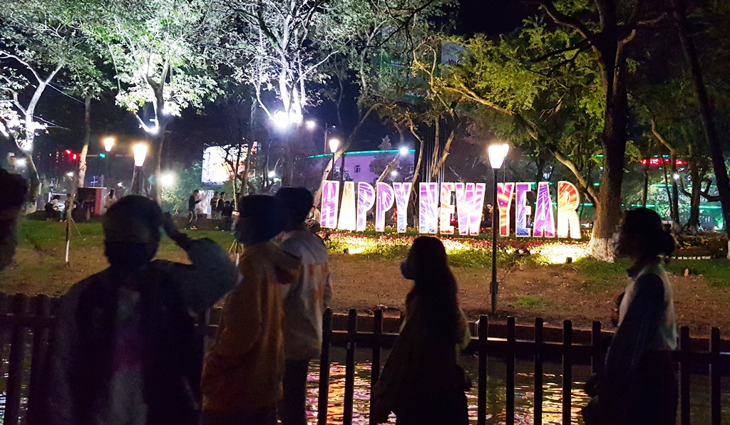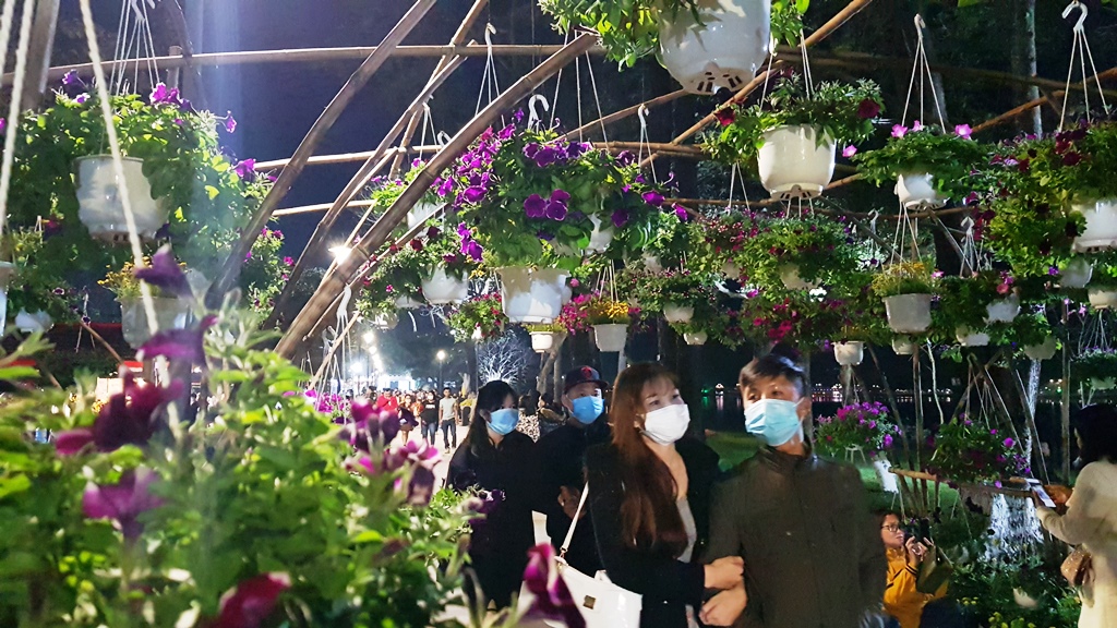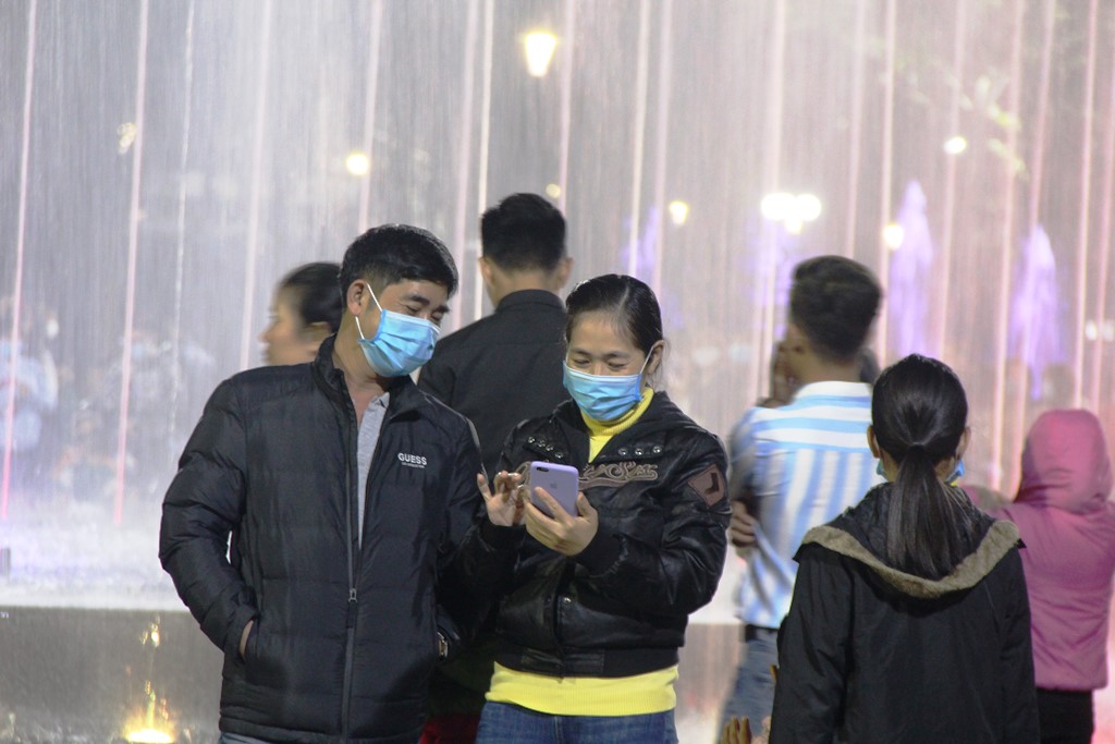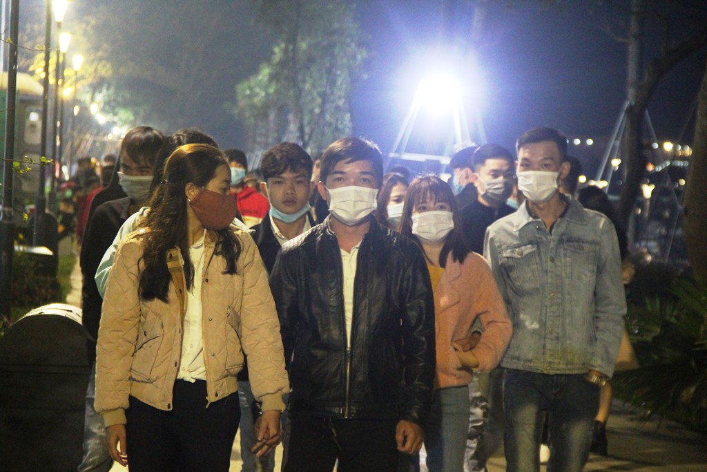 Đêm giao thừa trời tạnh ráo, se lạnh. Nhiều người đeo khẩu trang đổ về các khu vui chơi. Quanh các khu vui chơi, cơ quan chức năng bố trí rất nhiều bảng khuyến cáo, quét mã QR, nhắc nhở mọi người đeo khẩu trang và thực hiện đầy đủ các biện pháp phòng dịch.