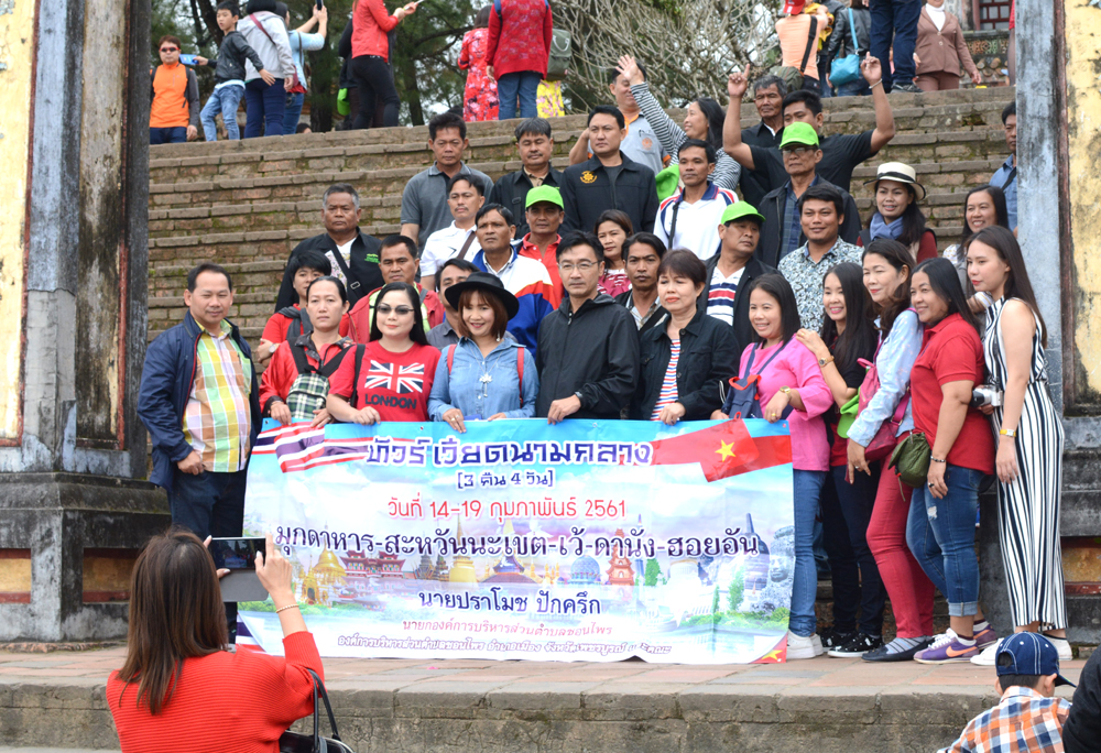 Một đoàn khách Thái chụp ảnh lưu niệm ngày đầu năm mới tại chùa Linh Mụ