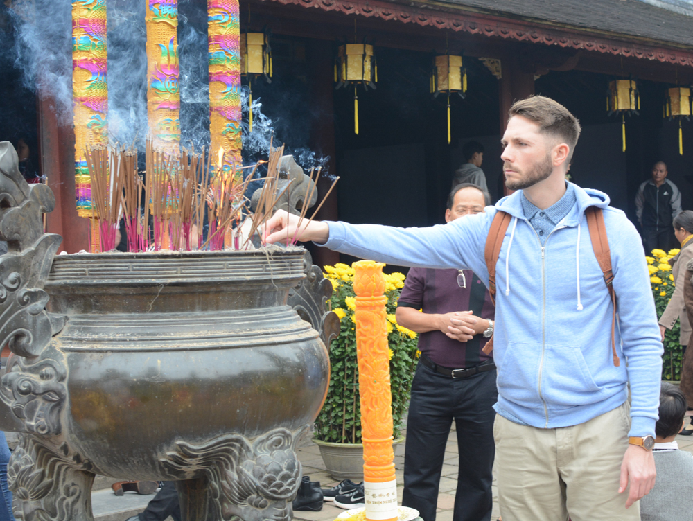 Khách châu Âu cũng thắp hương cầu an trong hành trình khám phá tết Việt tại Huế