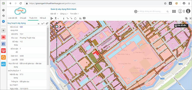Anh Lê Quang Lân cho biết, để tích hợp các thông tin về quản lý hiện trạng, quy hoạch xây dựng, trật tự xây dựng đô thị tại khu vực Kinh thành Huế lên nền GISHue cần trải qua 4 công đoạn chính, gồm: xây dựng cơ sở dữ liệu Geodatabase, thiết kế cấu trúc cơ sở dữ liệu GIS quản lý quy hoạch - trật tự xây dựng đô thị, xây dựng Bản đồ điện tử quản lý đô thị và cuối cùng là tích hợp bản đồ điện tử lên hệ thống thông tin địa lý tỉnh.