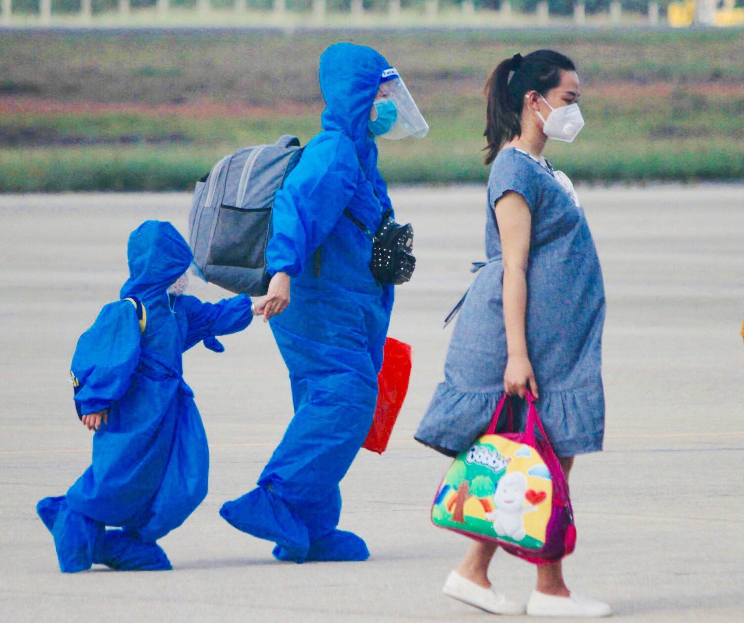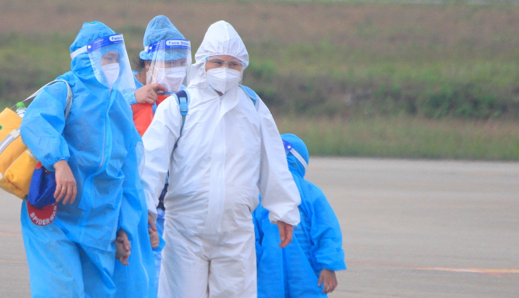 Ngay khi đặt chân xuống sân bay, các công dân được chia tốp, phân luồng, phun thuốc sát khuẩn