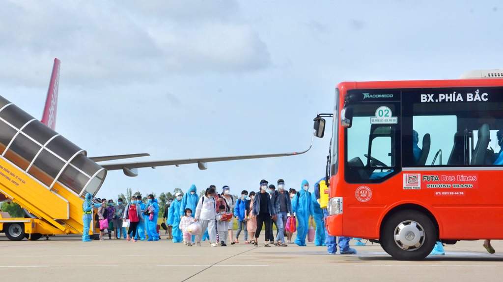 Ngay khi đặt chân xuống sân bay, các công dân được lực lượng chức năng phân luồng, chia tốp, phun thuốc sát khuẩn, sau đó lên 15 xe buýt Phương Trang đợi sẵn trong sân bay để di chuyển đến T3 để thực hiện cách ly theo quy định.