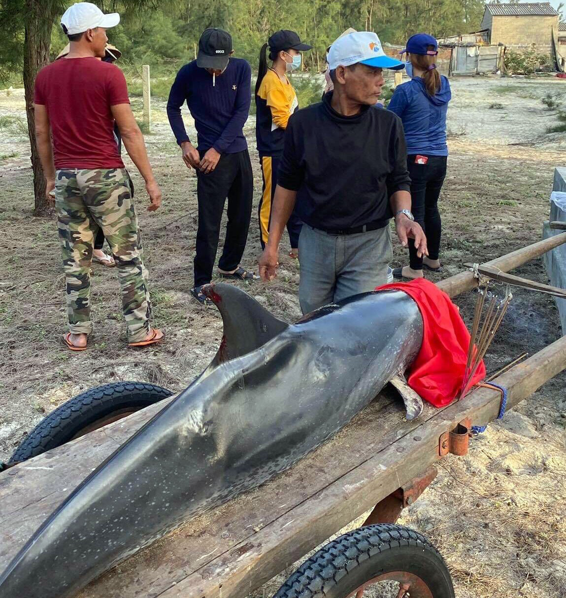 Trước đó, khoảng 15 giờ 00 cùng ngày, người dân phát hiện cá thể cá heo trôi dạt vào vùng gần bờ biển. Con cá heo này nặng gần 70kg, dài khoảng 2m. Trên thân cá heo có một vết thương lớn bán kính khoảng 10cm.