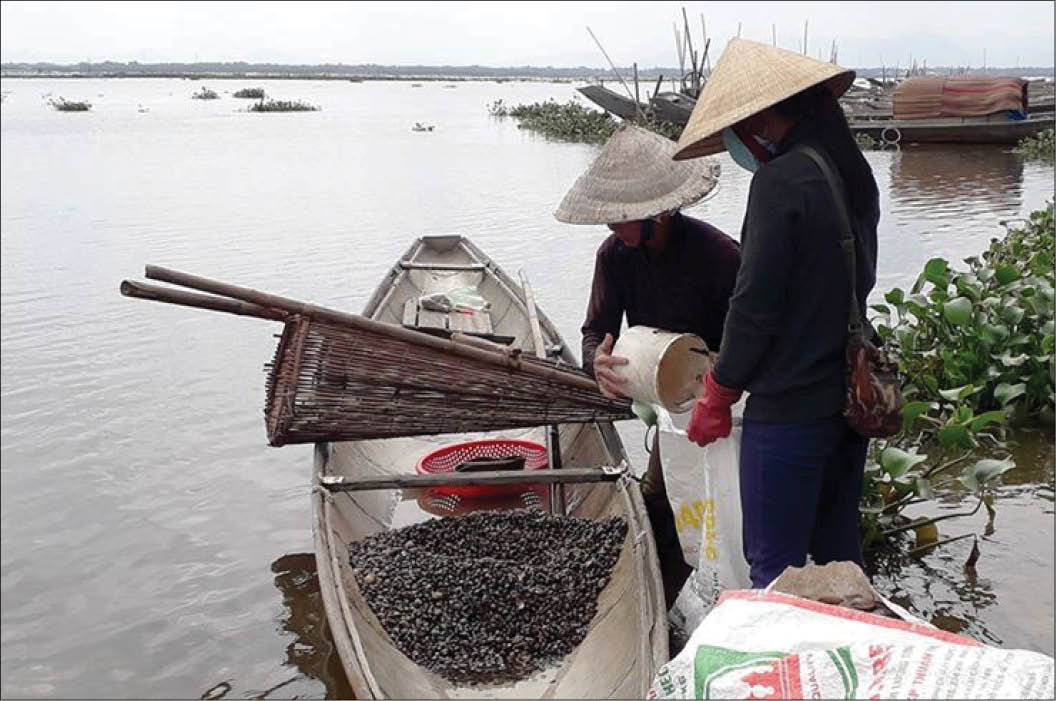 Ngư dân thôn 9, xã Điền Hòa sau chuyến đánh bắt hến tiền. Ảnh: QUỲNH VIÊN