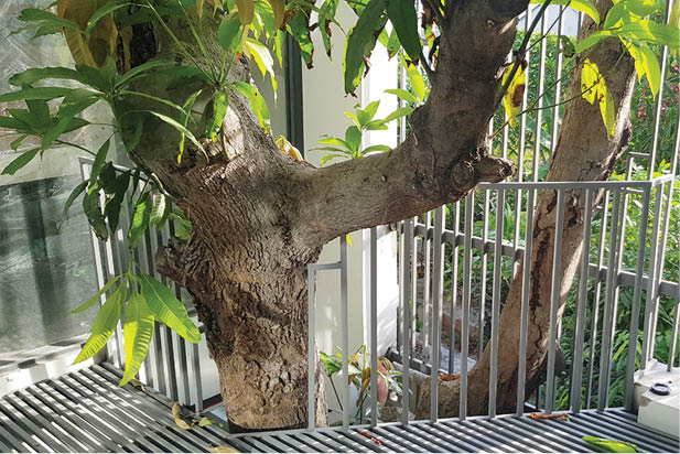 Nếu nhìn nghiêng, từng tầng ngôi nhà của anh Hòa đều có tán xanh tự nhiên tỏa bóng mát. Phía dưới thân cây xoài được làm hàng rào bảo vệ, chỉ vài mét vuông, không gian quanh gốc biến thành nơi uống trà, cà phê nhìn rất “chill”. Khu vực này nằm ở tầng thứ hai với chiều cao lý tưởng thành nơi ngắm cảnh thú vị. Để cây hòa hợp với căn nhà, anh Hòa đã tỉa bớt cành và làm giá đỡ. Anh đang tham khảo chuyên gia cây xanh để tạo điều kiện cho cây tiếp tục phát triển tự nhiên.
