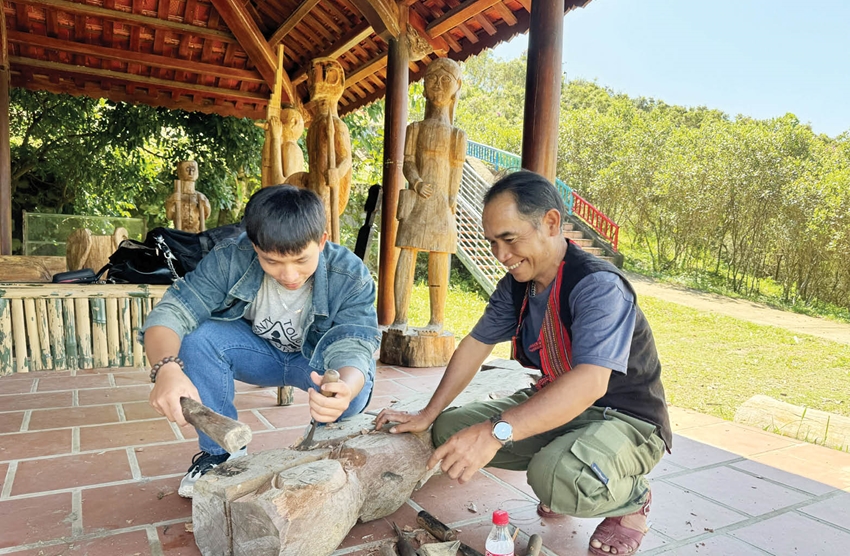 | Ông Cu Đài (bìa phải ) hướng dẫn khách du lịch điêu khắc gỗ |