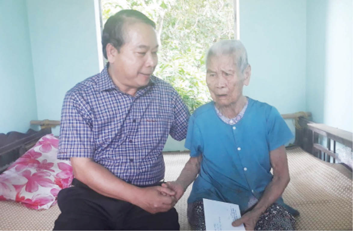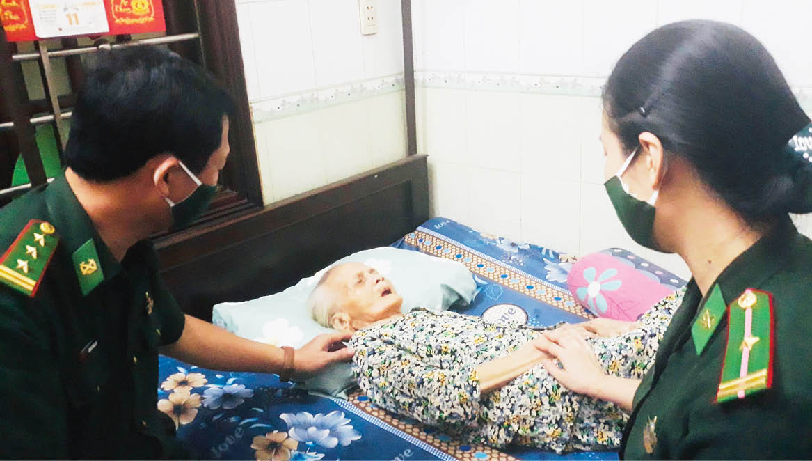 2. Lần này đến thăm Mẹ Việt Nam Anh hùng Nguyễn Thị Hường (96 tuổi, phường Xuân Phú, TP. Huế), thấy mẹ vẫn còn nằm trên giường, chưa ngồi dậy được, nhưng sức khỏe và tinh thần khá hơn, ánh mắt vui, sống động hẳn lên, Thượng tá Phạm Tùng Lâm, Phó Chính ủy, Bộ đội Biên phòng (BĐBP) tỉnh, Thiếu tá Trần Thị Nam Phương, Chủ tịch Hội phụ nữ, Thượng úy Nguyễn Văn Dực, Trợ lý công tác quần chúng, Phòng Chính trị, nhẹ lòng hơn. “10 ngày trước, mẹ yếu lắm, chúng tôi rất lo. Giờ thì đỡ lo nhiều rồi” - Thiếu tá Trần Thị Nam Phương nói, như thể đang nói về người mẹ ruột thịt của mình.