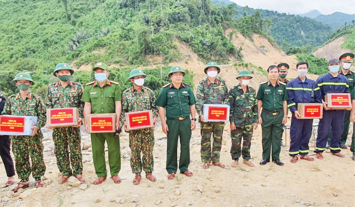 Thiếu tướng Lê Tất Thắng, Phó Tư lệnh Quân khu 4, Thượng tá Ngô Nam Cường, UVTV tỉnh ủy, Chỉ huy trưởng Bộ CHQS tỉnh, cùng đoàn công tác lên thăm, tặng quà động viên đồng đội tìm kiếm nạn nhân tại thủy điện Rào Trăng 3