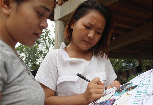 Vừa lách đường sợi để tạo hình họa tiết cặp đôi trái tim được một bạn trẻ thiết kế, nghệ nhân A Viết Thị Nhi vừa thừa nhận: “Lâu nay, quen thao tác họa tiết truyền thống rồi, giờ các bạn cho các mẫu mới nên thực hiện hơi chậm, nhưng làm ra thấy rất đẹp”.