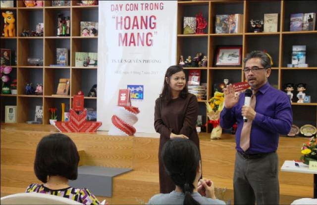 Tiến sĩ Lê Nguyên Phương (phải) chia sẻ với các bậc phụ huynh trong buổi ra mắt sách “Dạy con trong hoang mang” tại Huế