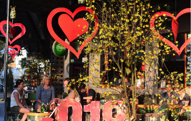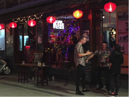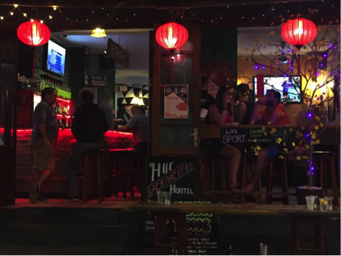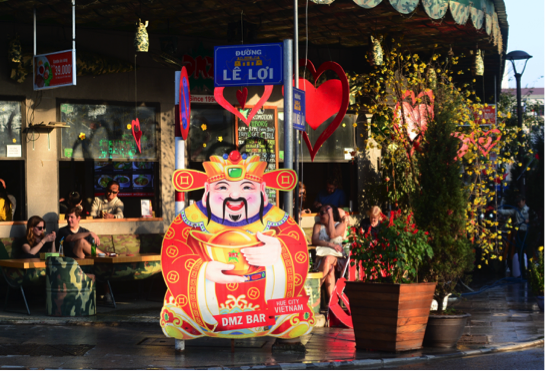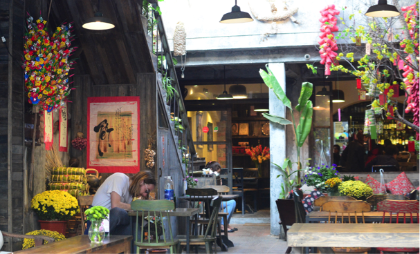 Du khách nghỉ chân tại quán cà phê, bar được trang trí công phu trên đường Phạm Ngũ Lão để nhìn ngắm và cảm nhận không khí tết tại Huế
