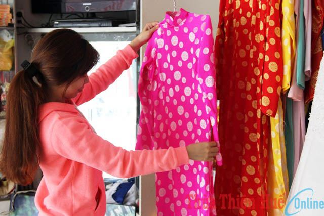 Tìm đến các tiệm áo cưới, cơ sở cho thuê trang phục biểu diễn, chúng tôi chứng kiến sự nhộn nhịp của hoạt động thuê áo dài đồng tiền chụp ảnh ngày Tết. Chị Nguyễn Thị Huyền Anh, quản lý một tiệm áo cưới đường Điện Biên Phủ (TP Huế) chia sẻ, áo dài đồng tiền là loại trang phục được sử dụng trong cưới hỏi cho những người bưng lễ. Những năm gần đây, giới trẻ chọn loại áo dài này để chụp ảnh Tết. Riêng ở Huế mới phổ biến từ trước Tết Nguyên đán Ất Mùi và năm nay có xu hướng đông hơn. Chị Huyền Anh nhấn mạnh: “Áo dài đồng tiền thường là loại áo gấm Thái Tuấn. Từ tháng 11 âm lịch, nhiều người đã tới xem áo. Đến tháng 12 thì họ tới đặt áo và thuê để đi chụp ảnh. Ngày cao điểm, nếu không đặt trước sẽ không còn áo. Tuy kinh doanh dịch vụ này không phải phục vụ cho người chụp ảnh mà để làm tiệc cưới hỏi, nhưng trong tháng cuối năm, loại trang phục này lại trở nên hút khách giúp kiếm thêm được khoảng lợi nhuận”.