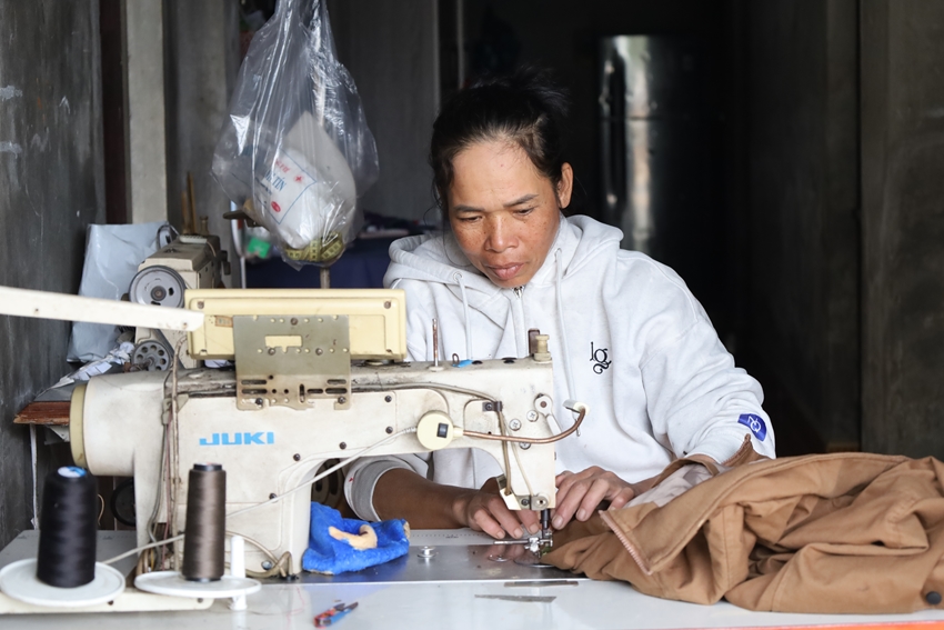 | Ngoài chăn nuôi, làm ruộng, chị Lê Thị Vân (thôn Phú Gia) còn tranh thủ nhận may, sửa quần áo |