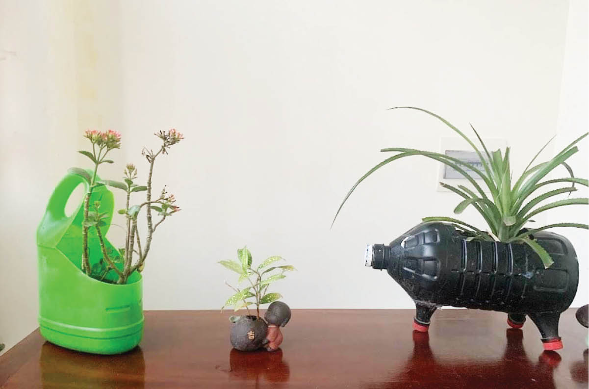 Chậu hoa tái sử dụng từ rác nhựa của các em học sinh