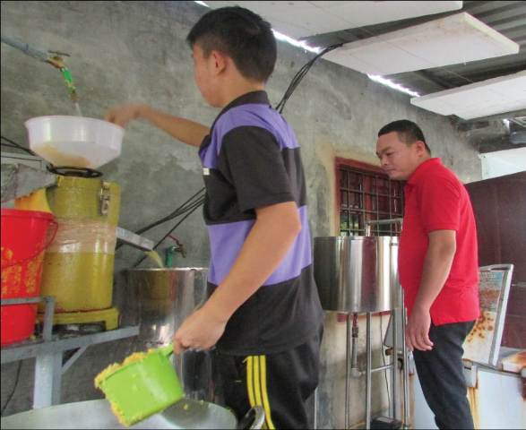 Anh Vững (phải) kiểm tra công đoạn sản xuất sữa bắp