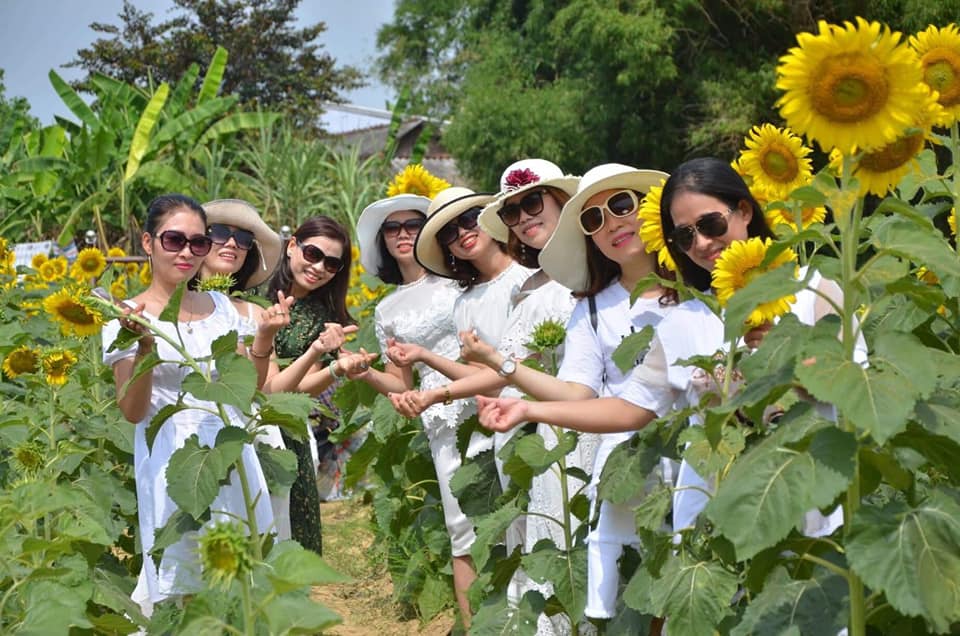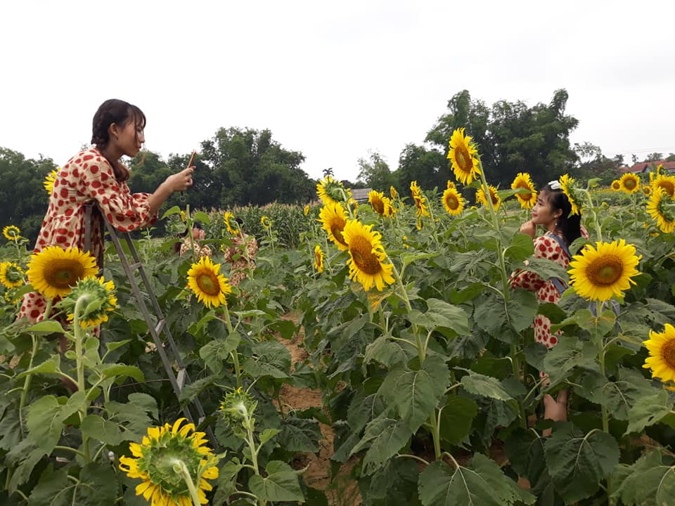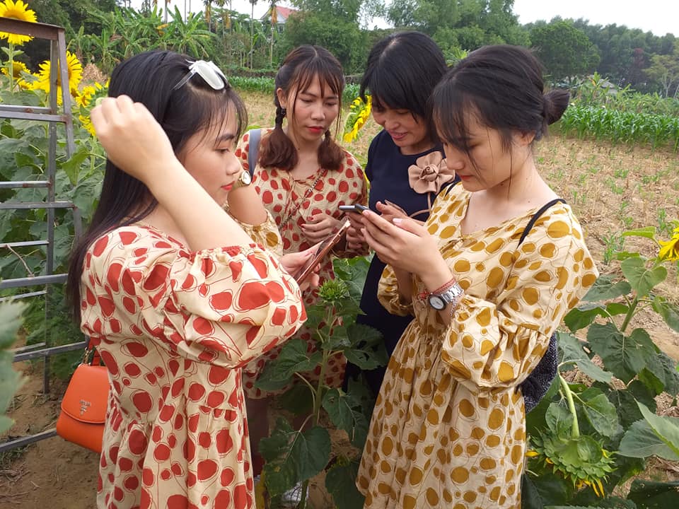 Chị Hoa từ thị xã Hương Thủy đi cùng nhóm bạn sau một hồi say sưa chụp ảnh cho nhau, cười hỉ hả bảo hôm nay thứ bảy, là ngày nghỉ đầu tiên của kỳ nghỉ lễ, các chị làm nghề buôn bán, không đi chơi xa được nên quyết định nghỉ một buổi để chơi lễ cho thật thoải mái. Rất mới trên địa bàn TP.Huế nên cánh đồng hoa hướng dương chính là điểm “sống ảo” hấp dẫn và thích hợp. Vừa được ngắm hoa thỏa thích, hít thở “không khí hoa”, vừa được chụp ảnh đẹp giữ làm kỷ niệm và “khoe” với mọi người.