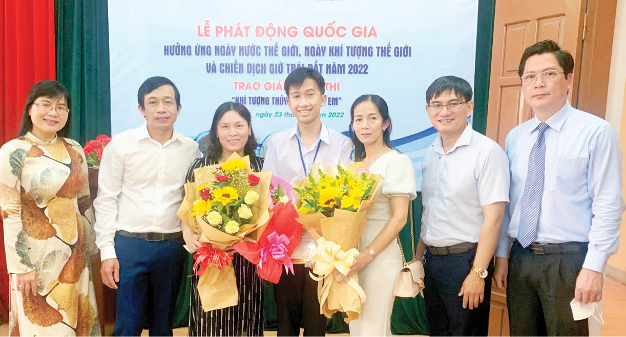 Trần Lê Bửu Tánh (giữa) trong ngày được vinh danh giải Nhất cuộc thi “Khí tượng Thủy văn trong em” do Tổng cục Khí tượng Thủy văn (Bộ Tài nguyên và Môi trường) tổ chức. Ảnh: NVCC