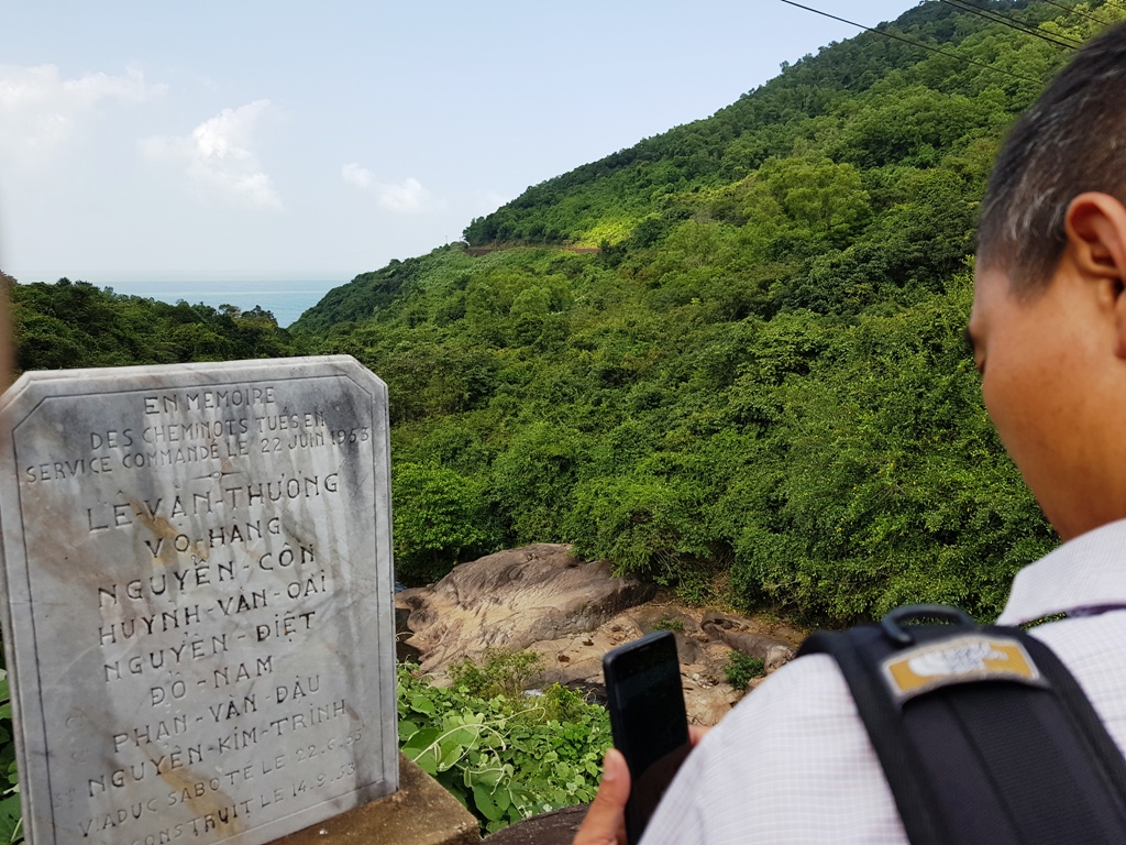 Một bia tưởng nhớ nằm dọc theo đường sắt đi qua Hải Vân. Theo những người gác tàu ở cung đường này, bia này tưởng niệm những người mất khi đi qua đây