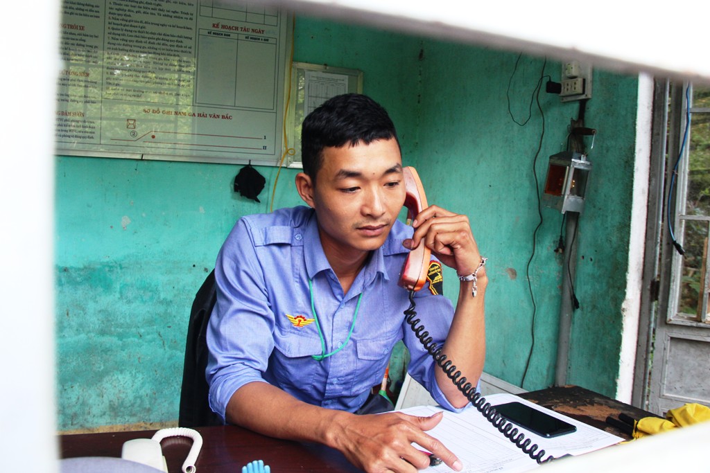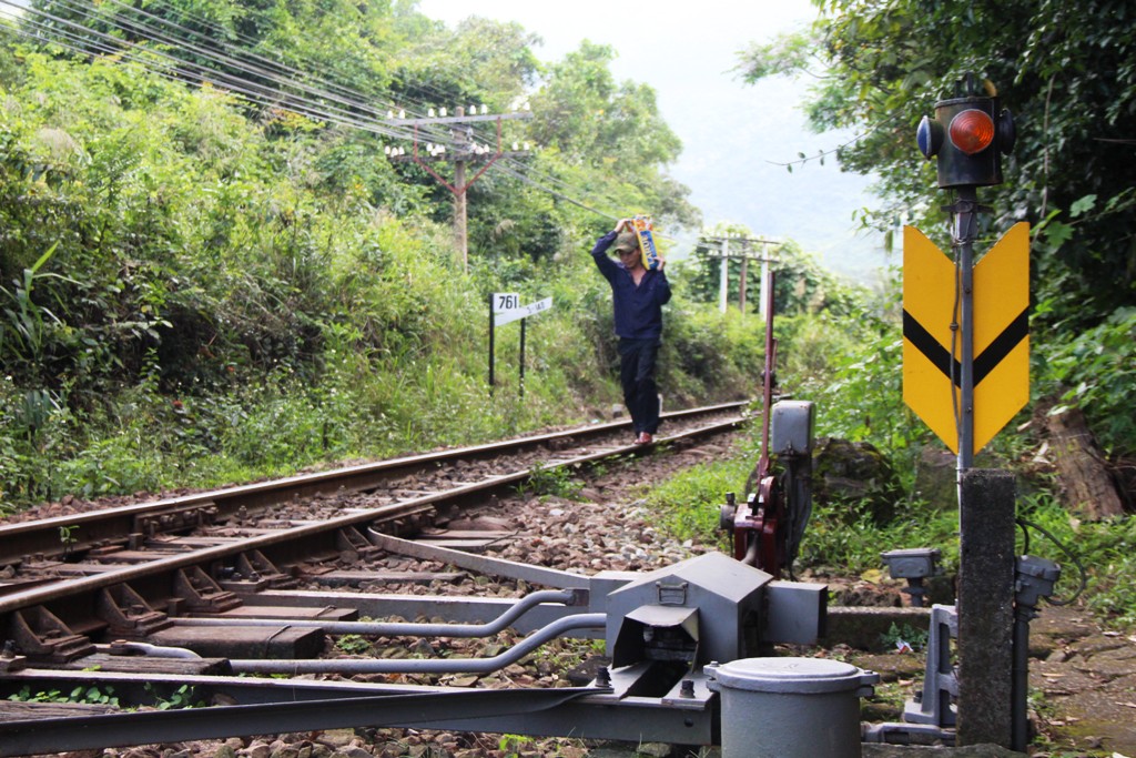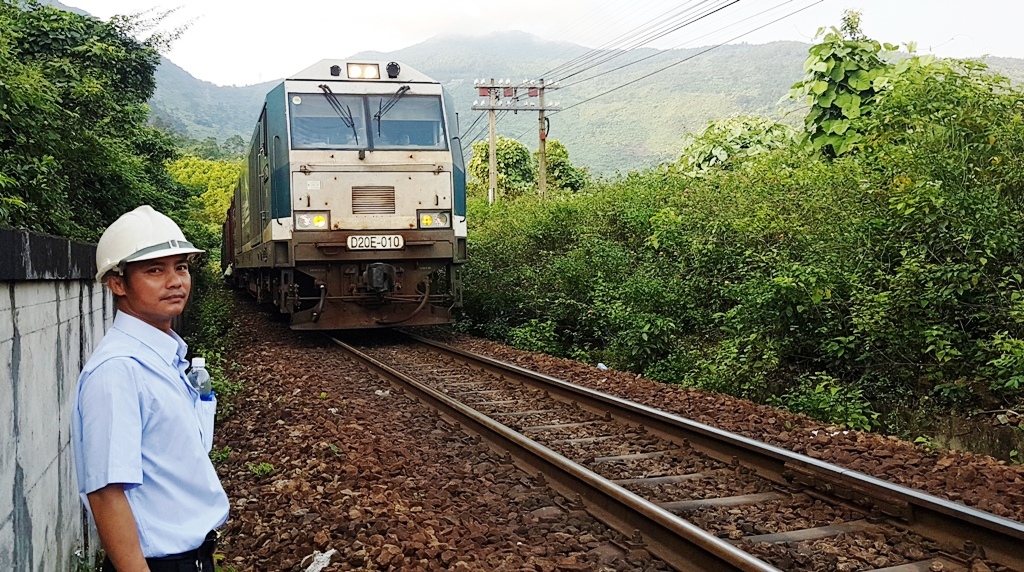 Một bên nhìn lên đồi núi bạt ngàn, nhìn xuống một bên màu nước biển xanh ngọc cùng tiếng sóng vỗ dồn dập và từng luồng gió rít mạnh. Hành trình ấy như cuốn hút và gây cho chúng tôi sự tò mò. Thi thoảng trên hành trình này, chúng tôi bắt gặp những nhân viên ngành đường sắt làm nhiệm vụ một mình vô cùng lặng lẽ.