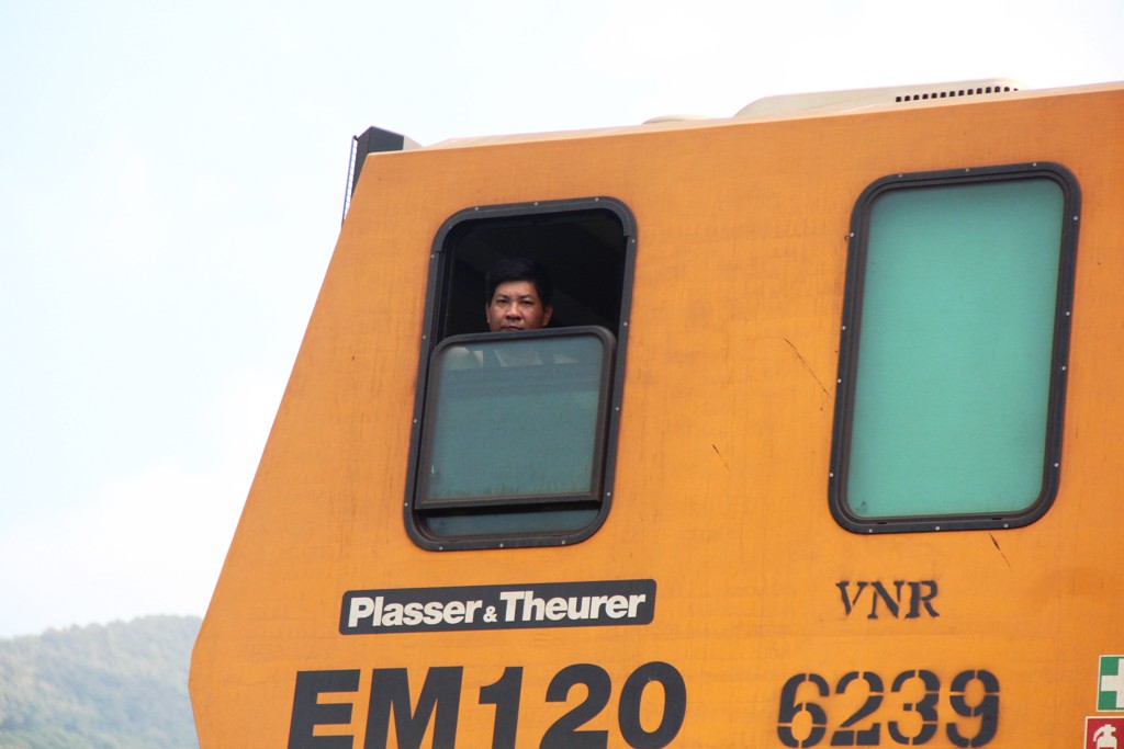 Khuôn mặt của một lái tàu nhìn qua ô cửa, bởi lẽ hiếm khi mới thấy được những người đi bộ đi sâu vào tuyến đường sắt này