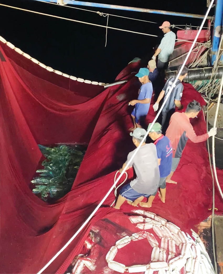 Hai chiếc tàu cá ông Quân sau hơn một ngày chạy liên tục thì cũng đến vùng đánh cá. Trời yên, sóng nhẹ, từng đàn cá bắt đầu nổi. Ban đêm họ chong một bóng điện rồi đặt trên một chiếc bè. Một ngư dân chèo ra giữa để thu hút cá. Nhìn thấy ánh sáng, hàng chục đàn cá bơi tới. Chúng bơi cách mặt nước tầm 40-50m. Chiếc tàu cá chạy hết tốc lực và mất khoảng 10 phút để thả hết những tấm lưới dài 1,2km bao quanh đàn cá.