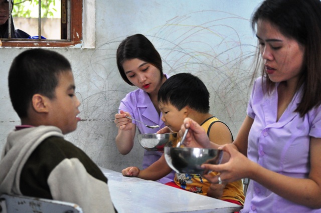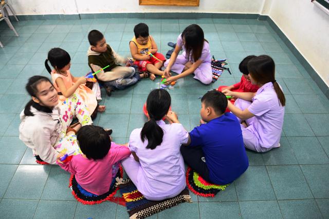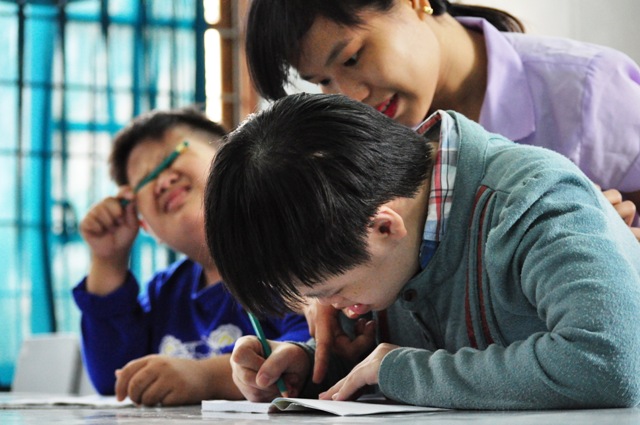 Tại lớp trí tuệ thấp nhất (lớp E), các cháu được các cô chỉ dạy, uốn nắn từng kỹ năng
